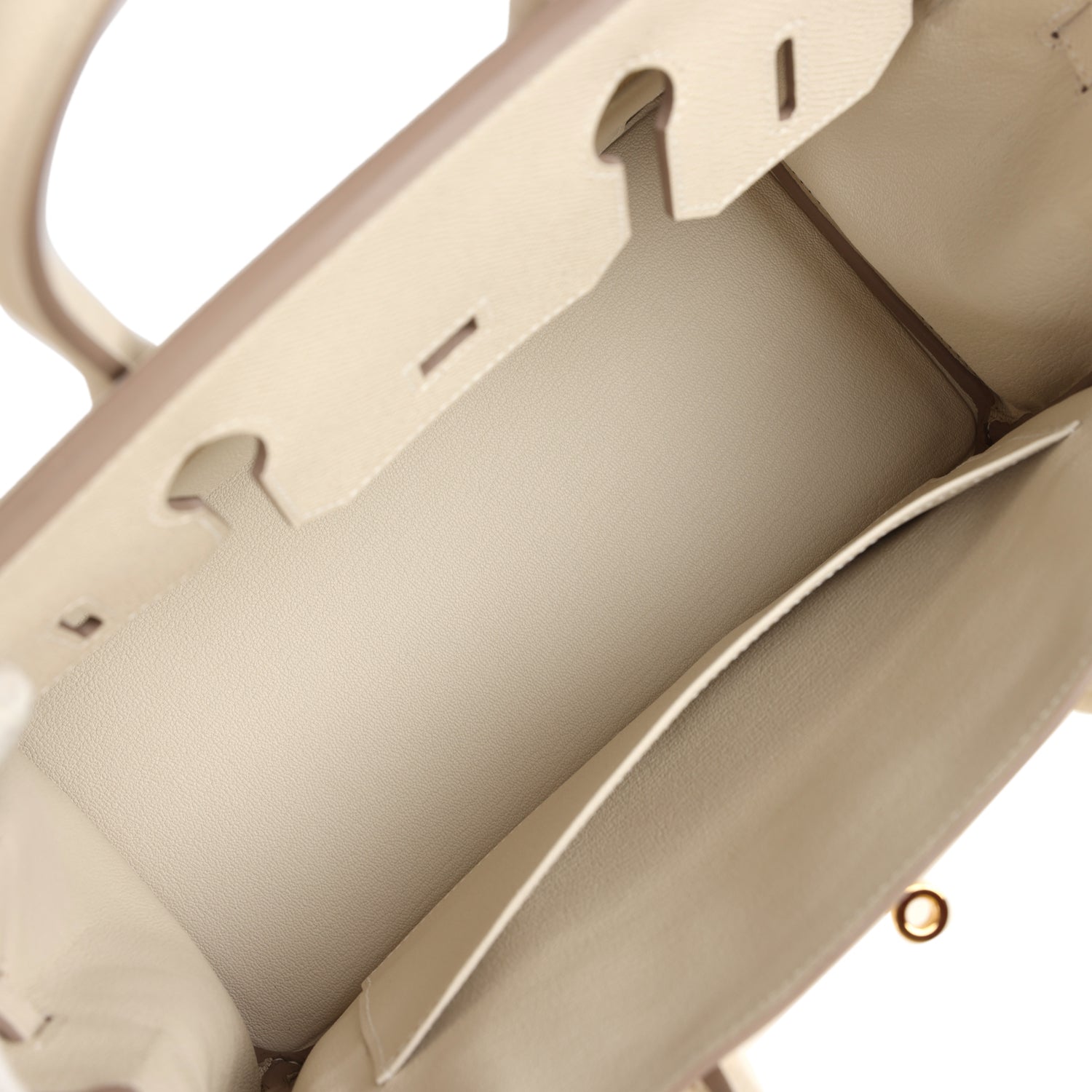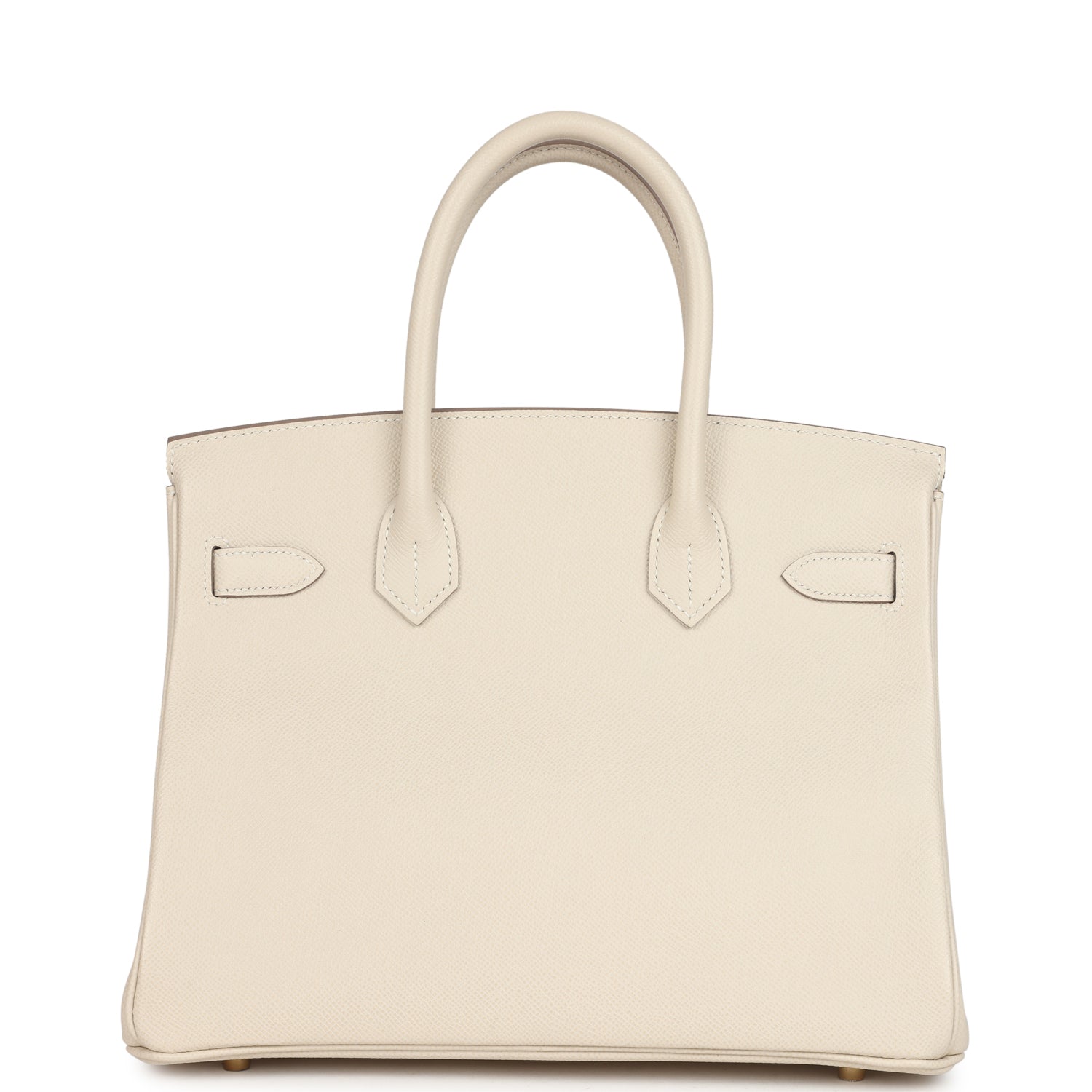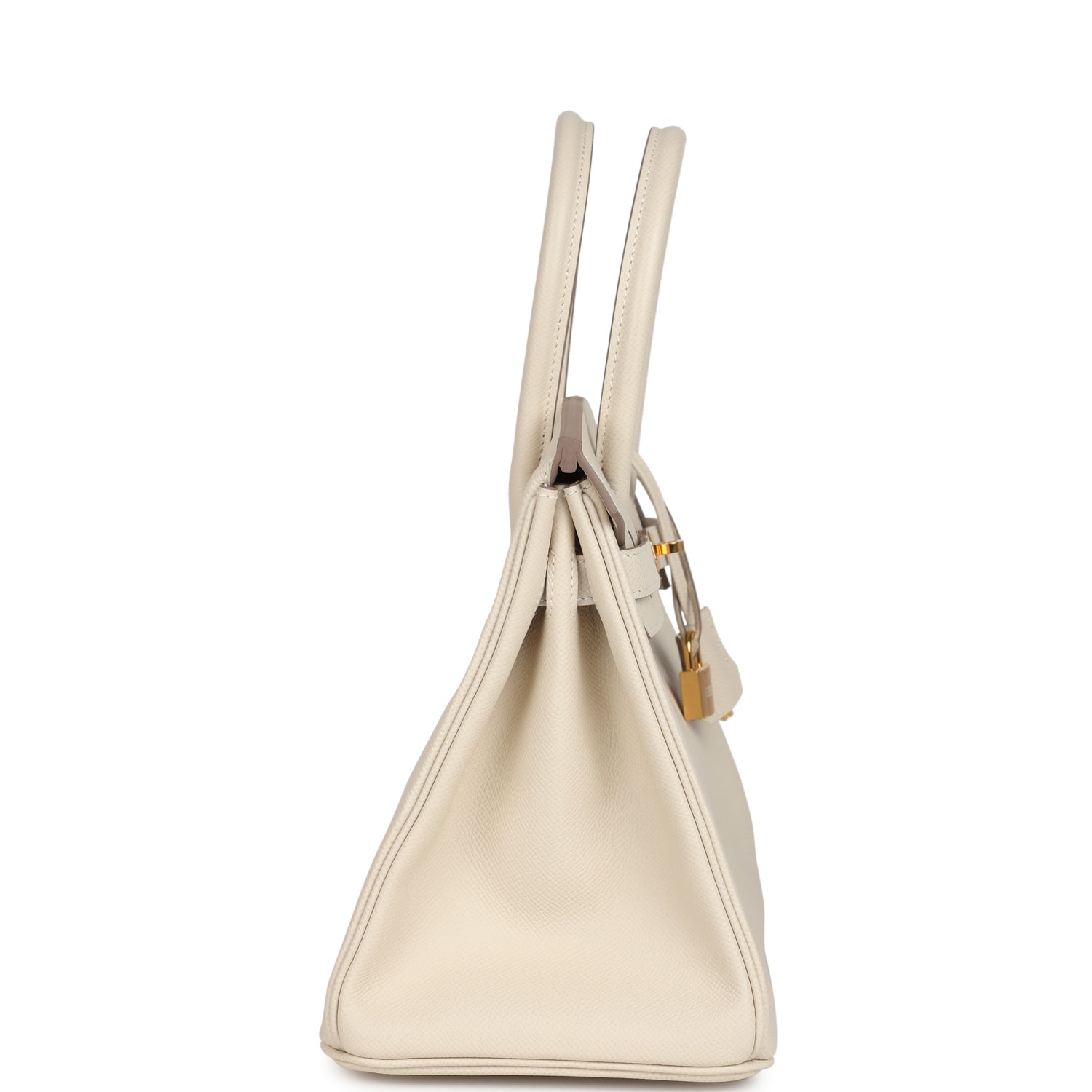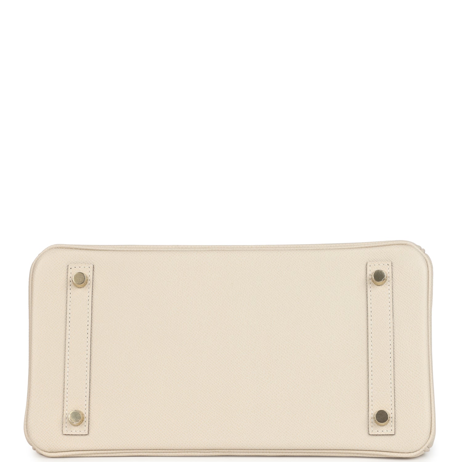 This Birkin is in Craie epsom leather with gold hardware and has tonal stitching,?front flap, two straps with?center?toggle closure, clochette with lock and two keys, and double rolled handles.