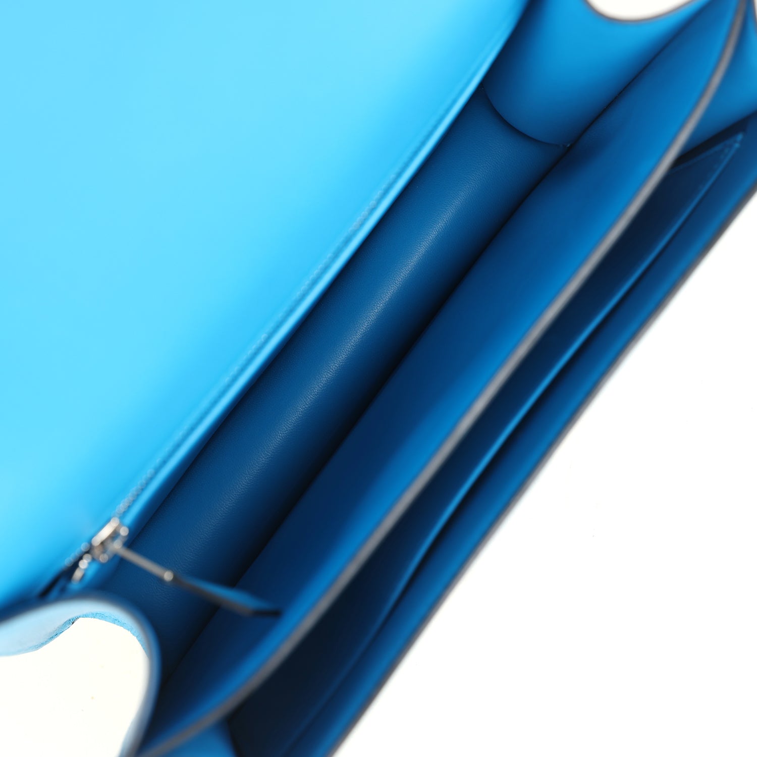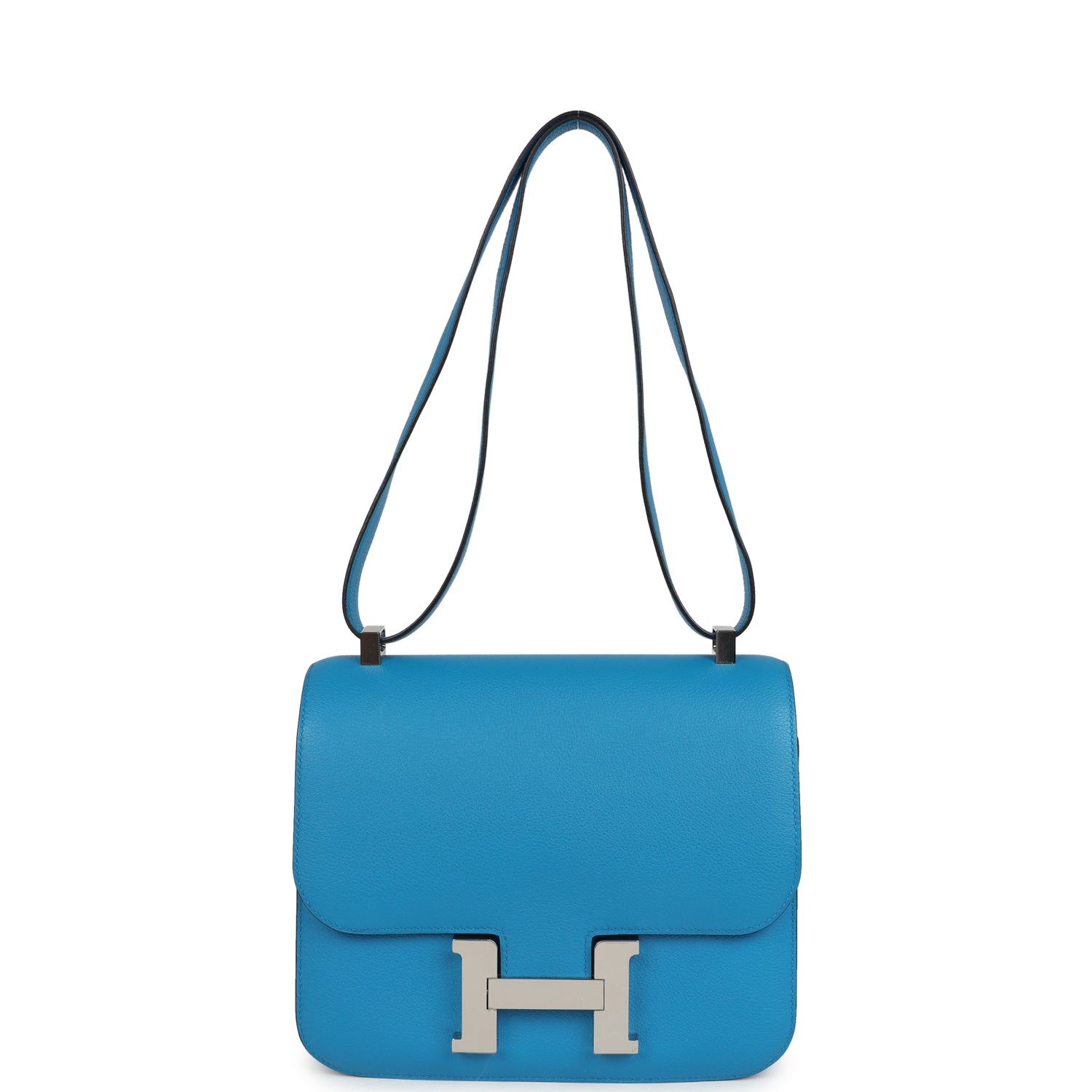 This Hermès Constance, is in Bleu Zanzibar evercolor leather with palladium hardware and features tonal stitching, a "H" snap lock closure, and an adjustable shoulder strap.