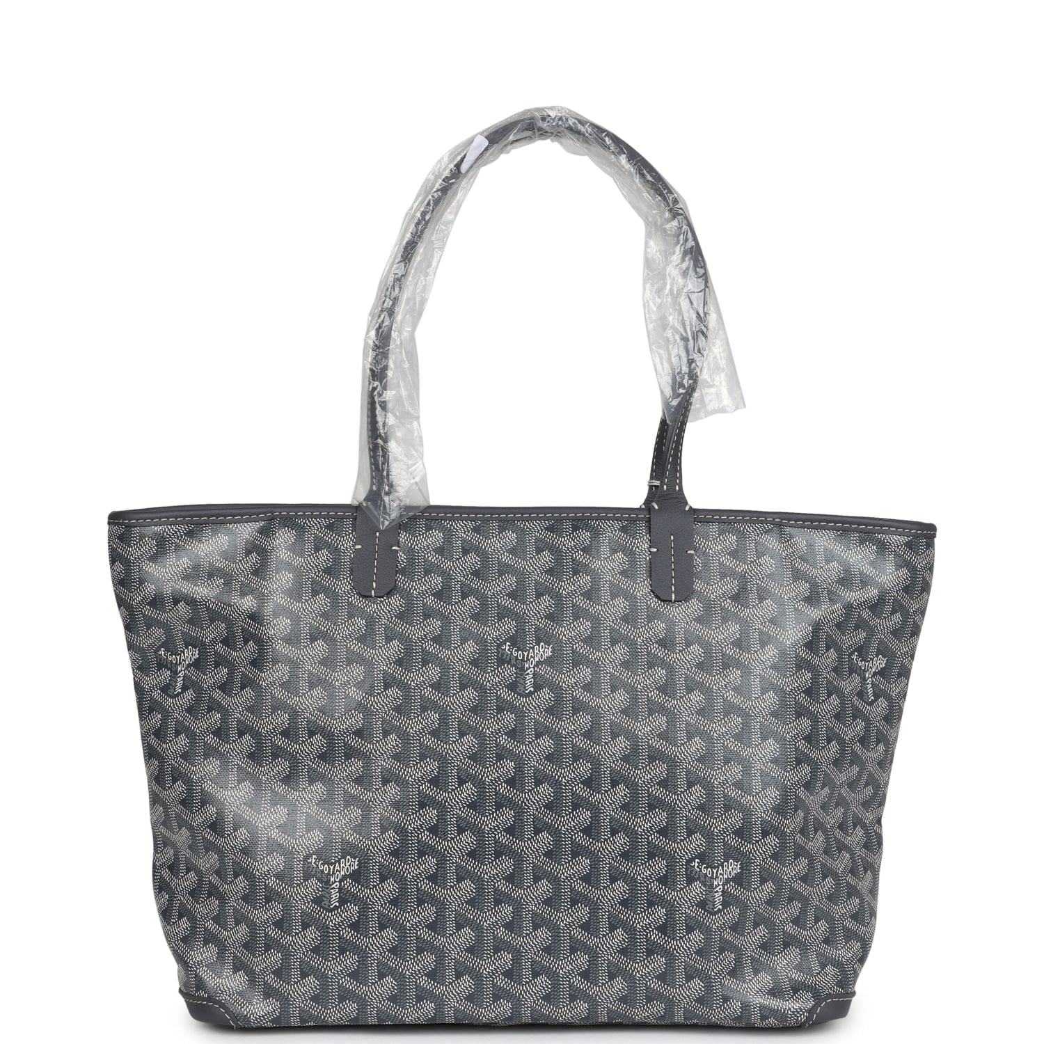This Goyard Artois PM tote is of grey Goyardine canvas and chevroches calfskin leather with palladium tone hardware, features contrast stitching, two flat black leather handles, zip top closure and an inside floating pocket.