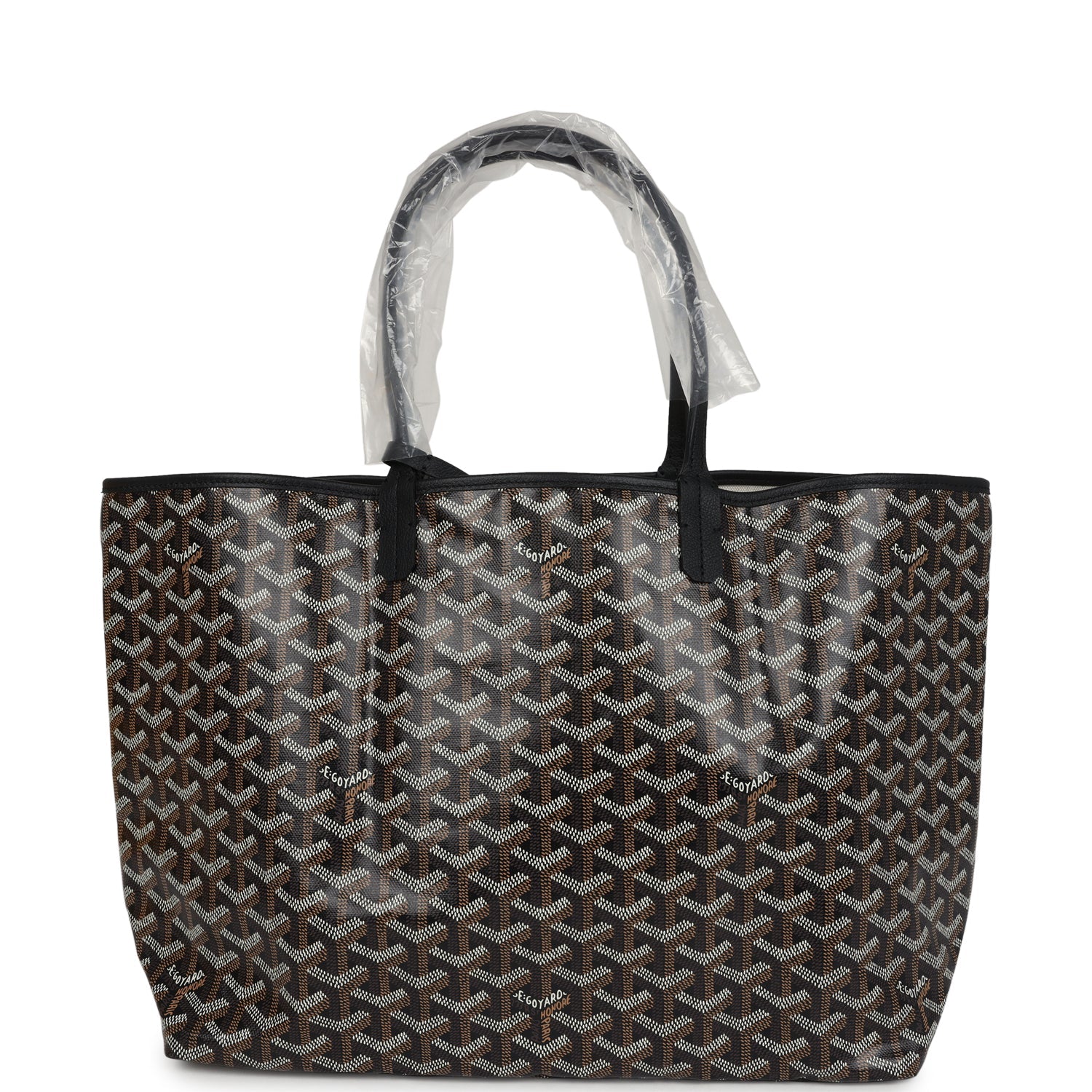 This Goyard Saint Louis PM tote is in black Goyardine coated canvas and black chevroches calfskin leather with palladium hardware, tonal stitching, and has a matching detachable button closure wallet.