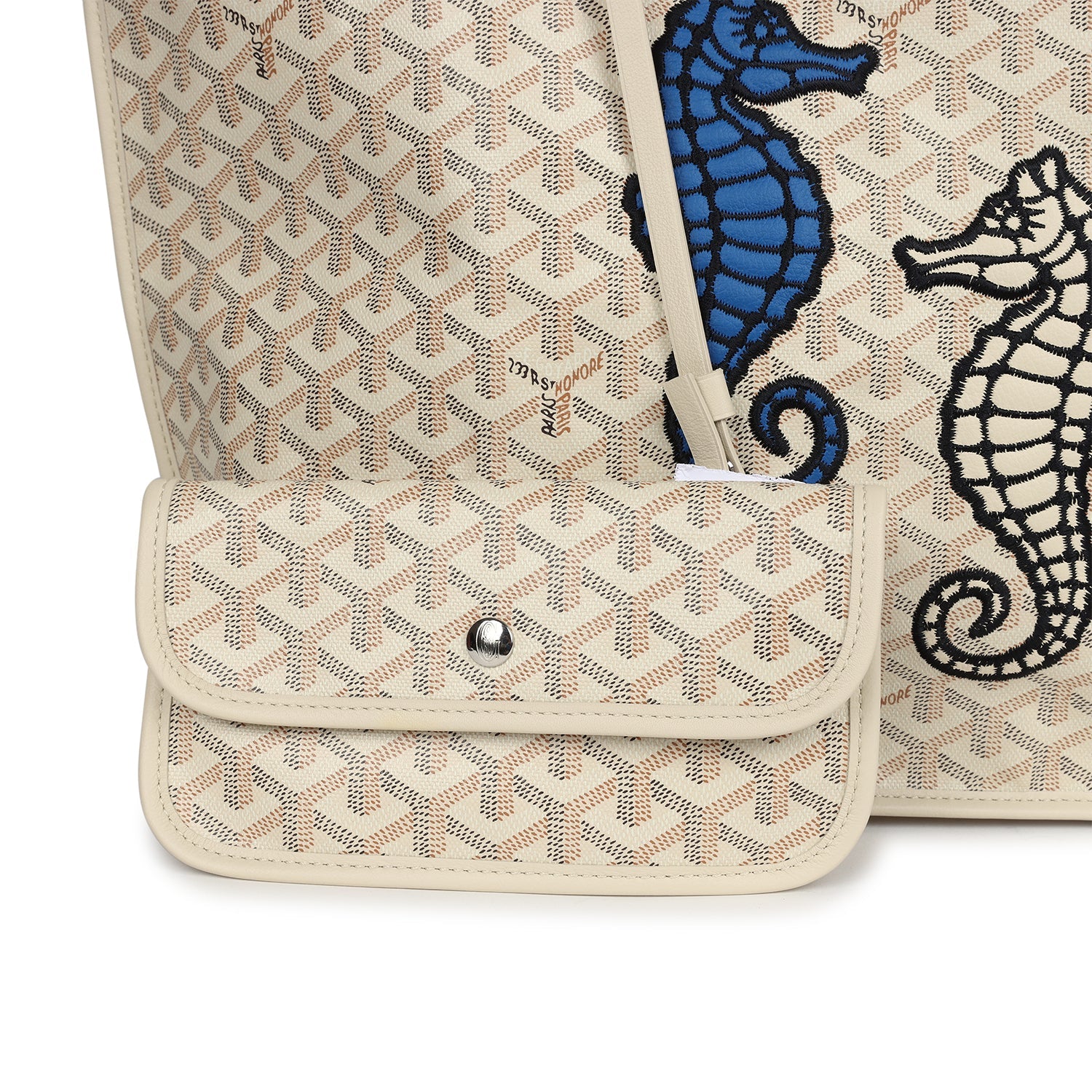 This limited edition Goyard Anjou PM reversible tote bag is in sand chevroches calfskin and Goyardine canvas with two embroidered seahorses, palladium hardware,tonal stitching, and a detachable sand coin purse.?