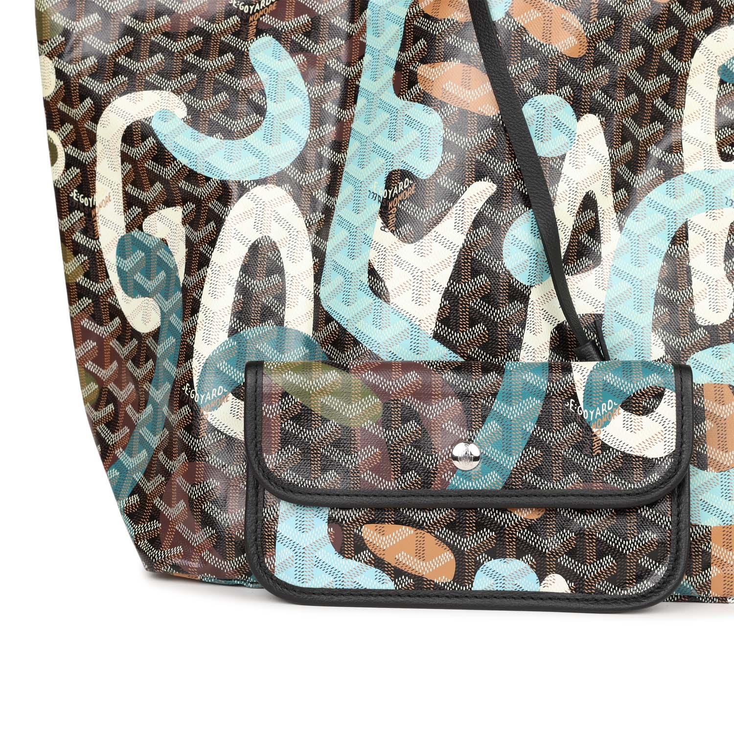 This Limited Edition Goyard St Louis GM is in black Goyardine canvas with large blue camouflage letters, palladium hardware, tonal stitching, and has a matching detachable button closure wallet