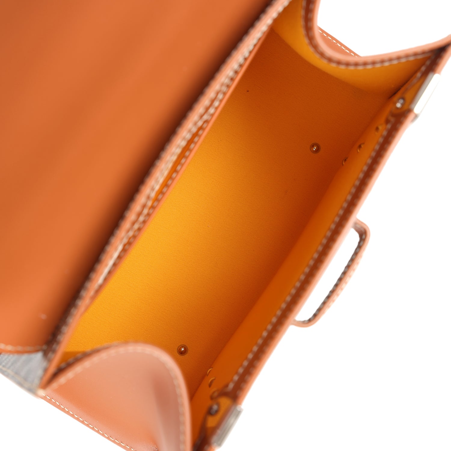 The interior is lined in yellow Nievre goatskin lining and has one interior slip pocket on rear wall.
