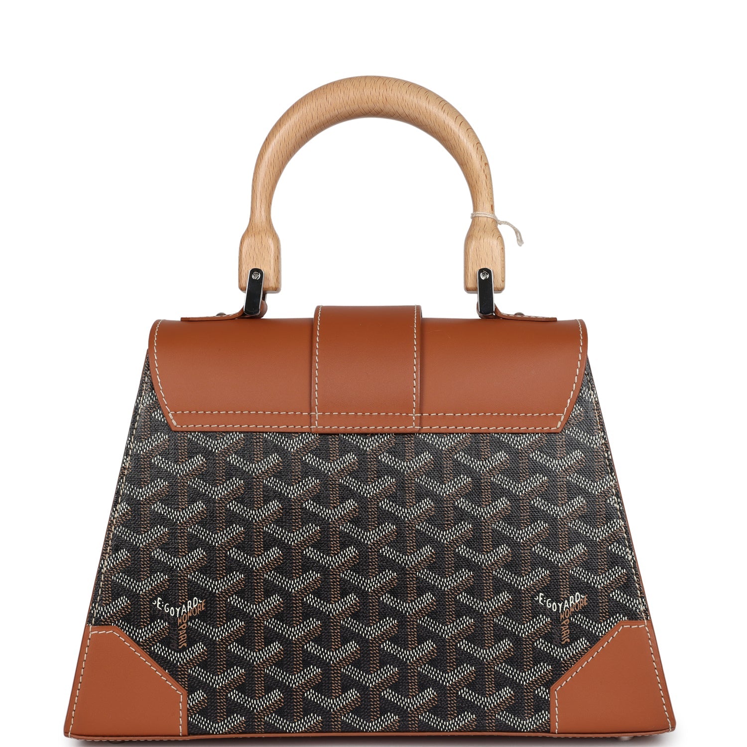 This Goyard Goyardine Canvas black and tan Structure Saigon PM Bag is in black Goyardine coated canvas and Tan chevroches calfskin lining with palladium hardware, contrast stitching, wooden top handle, wooden panels down front, palladium studs, and a detachable shoulder strap.