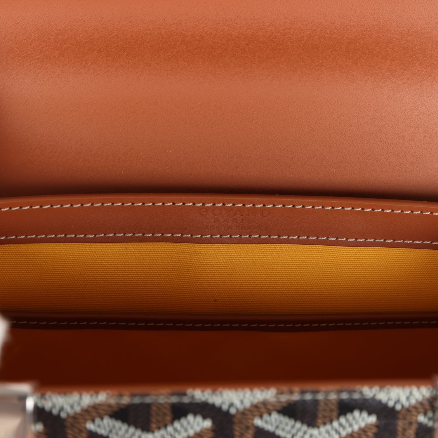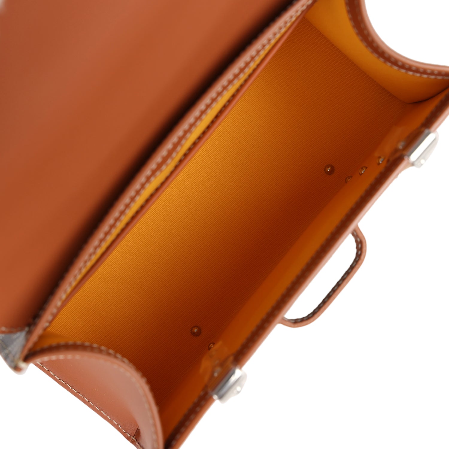 The interior is lined with yellow lining with one slip pocket on the rear wall.