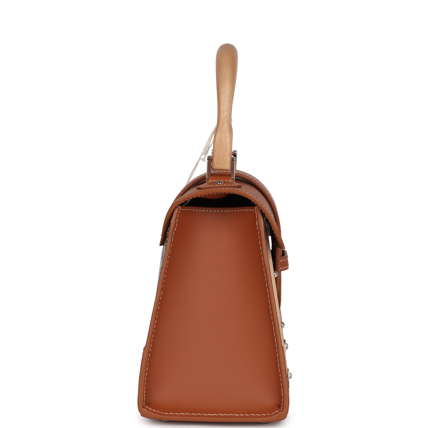 This?Structur�� Saigon Mini bag is of black and brown Goyardine coated canvas and brown Cervon calfskin leather with palladium hardware, features contrast stitching, front flap, two wooden front panels with palladium studs, wooden top handle, and a removable strap.