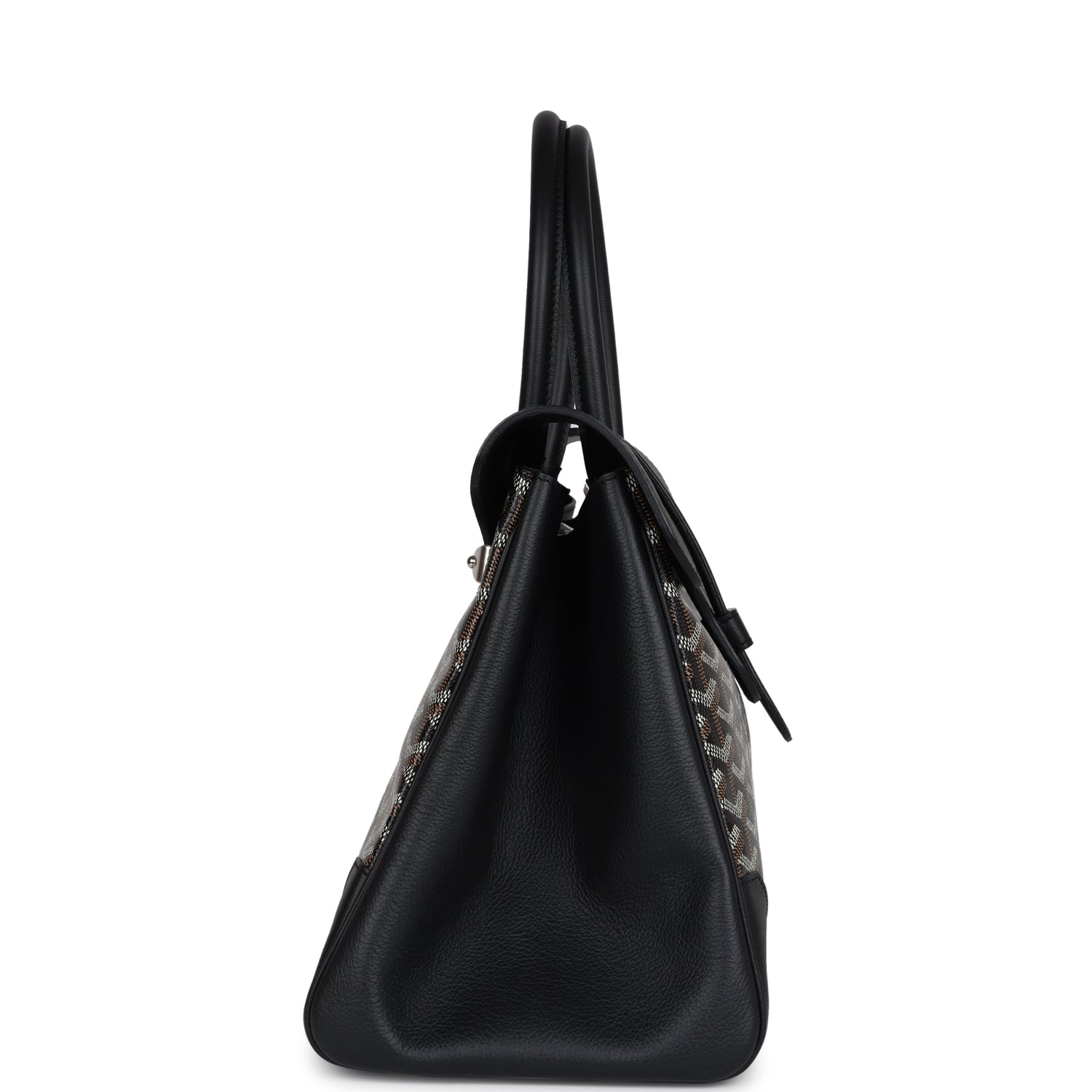 This?Soft Saigon Tote is in black Goyardine coated canvas and Chevroches calfskin with palladium hardware, tonal stitching, features two double rolled top handles, signature saigon leather strap and loop closure, a cutout in the top of the flap for the handle to fit through.
