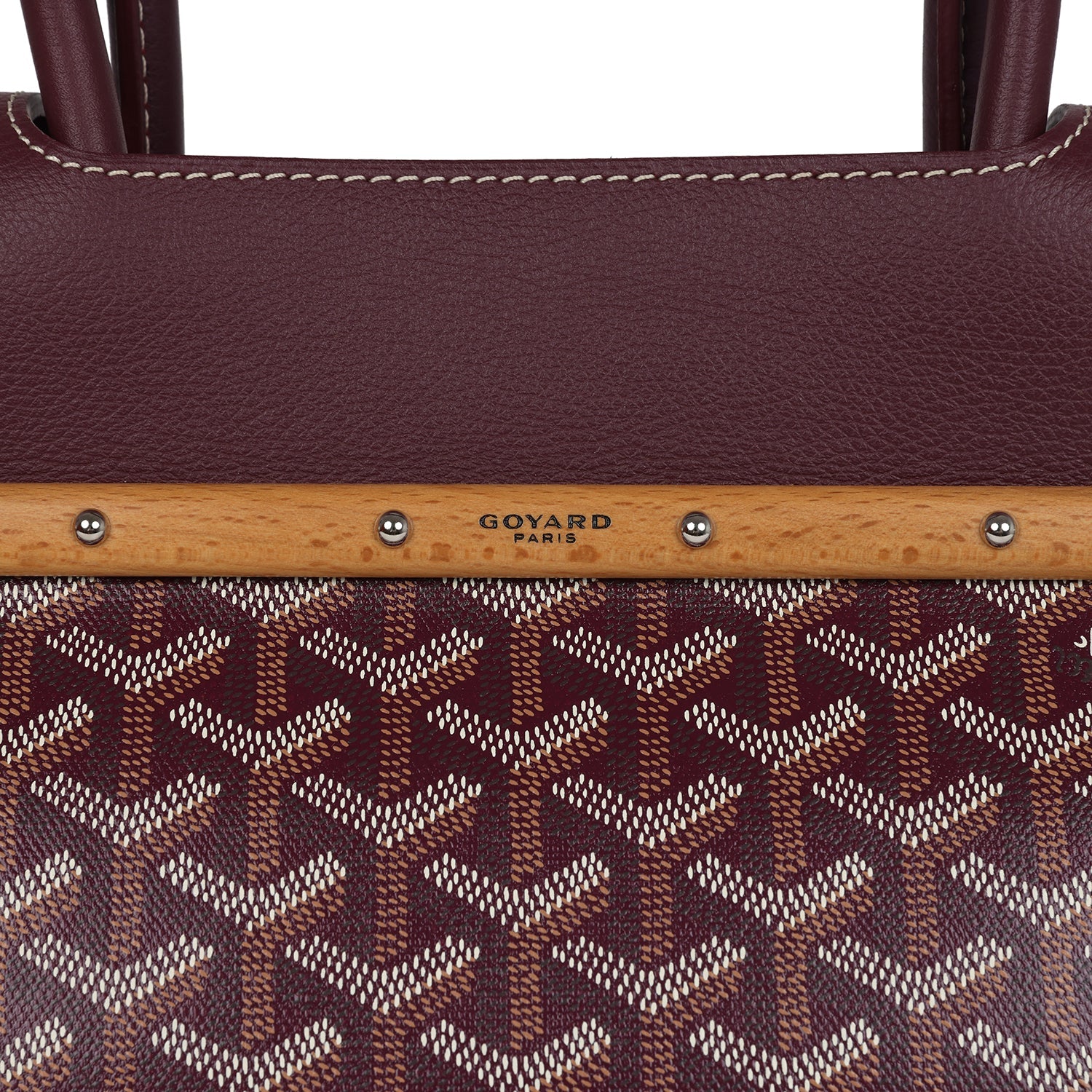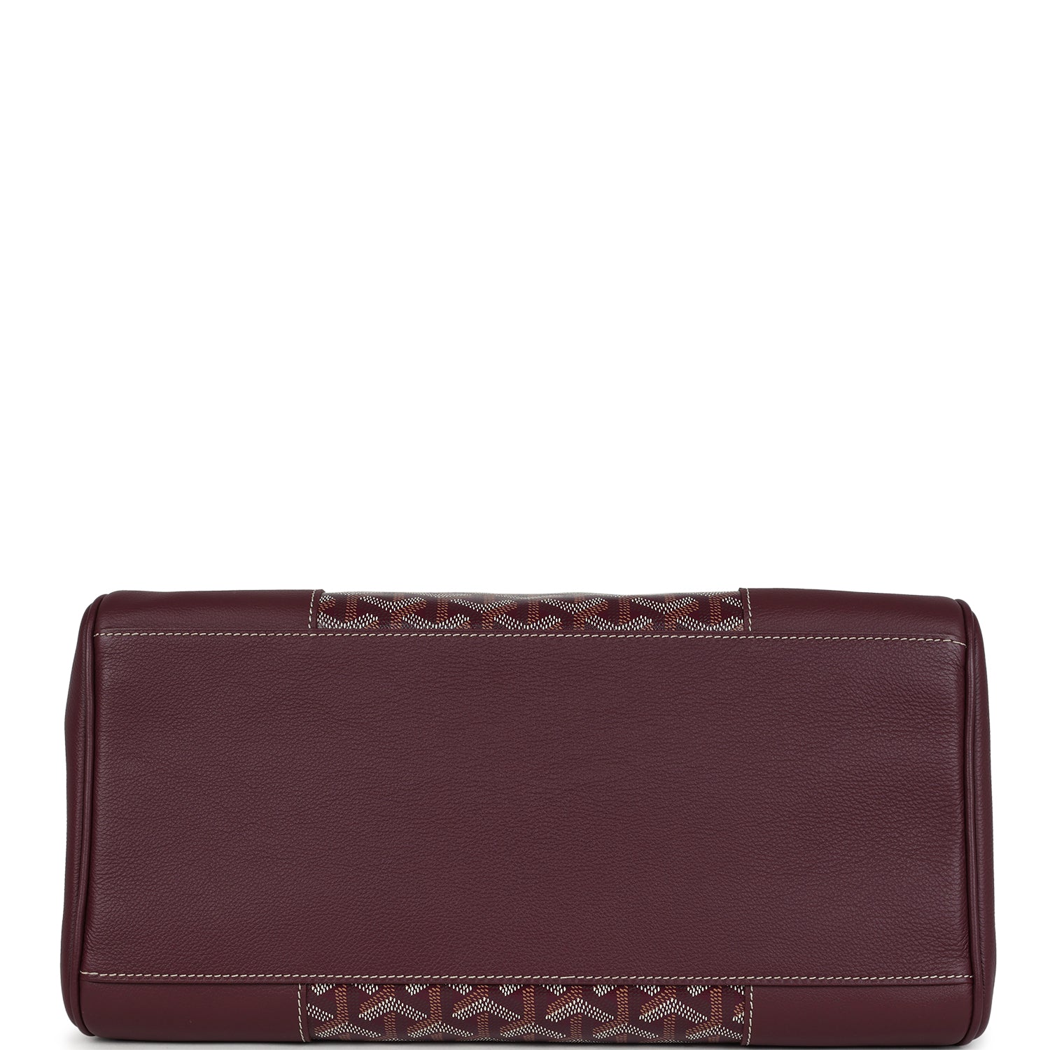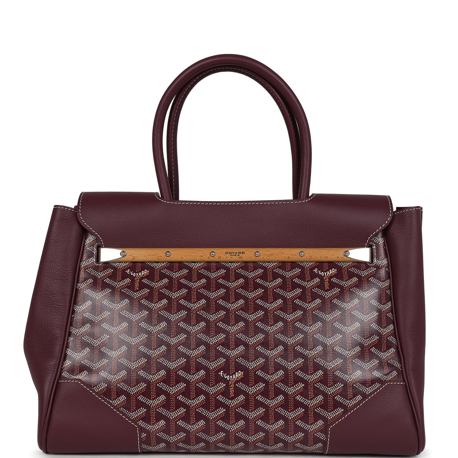 This Soft Saigon Tote is in burgundy Goyardine Coated Canvas and Chevroches Calfskin with palladium hardware, contrast stitching, features two double rolled top handles, signature saigon leather strap and loop closure, a cutout in the top of the flap for the handle to fit through.