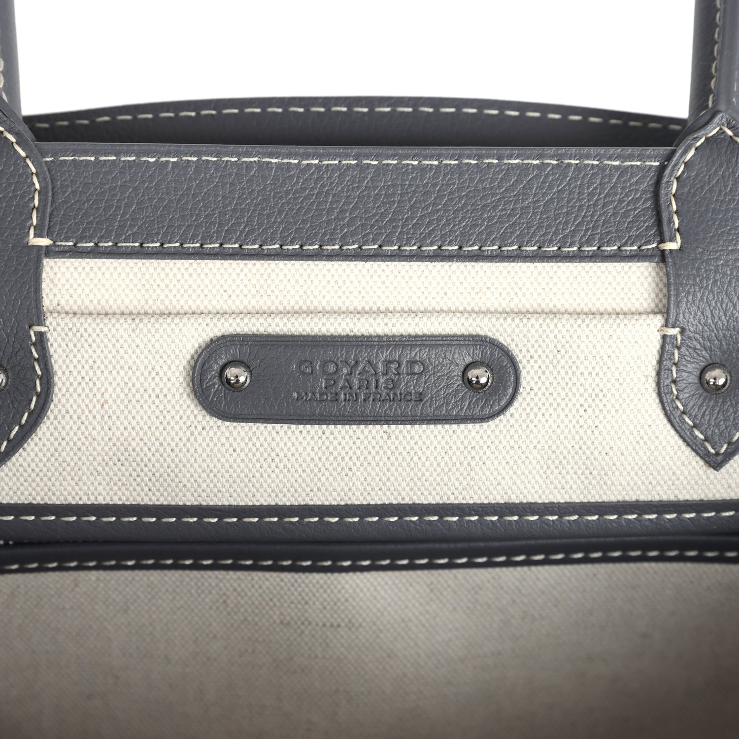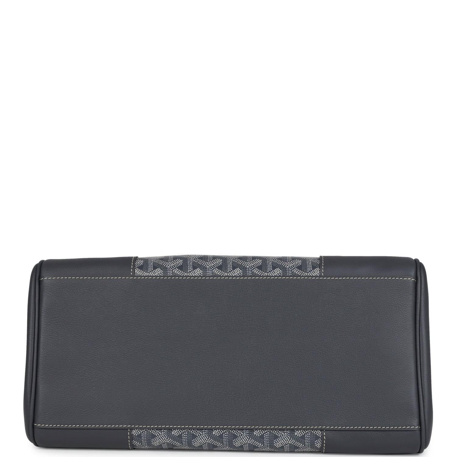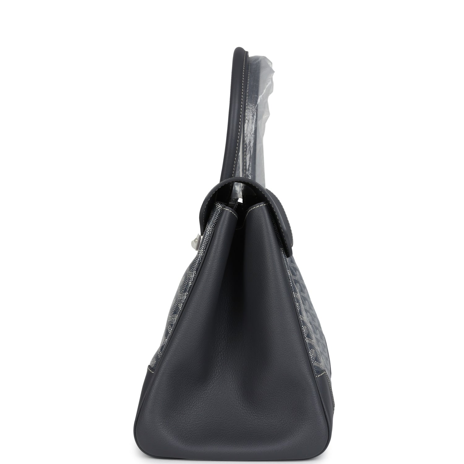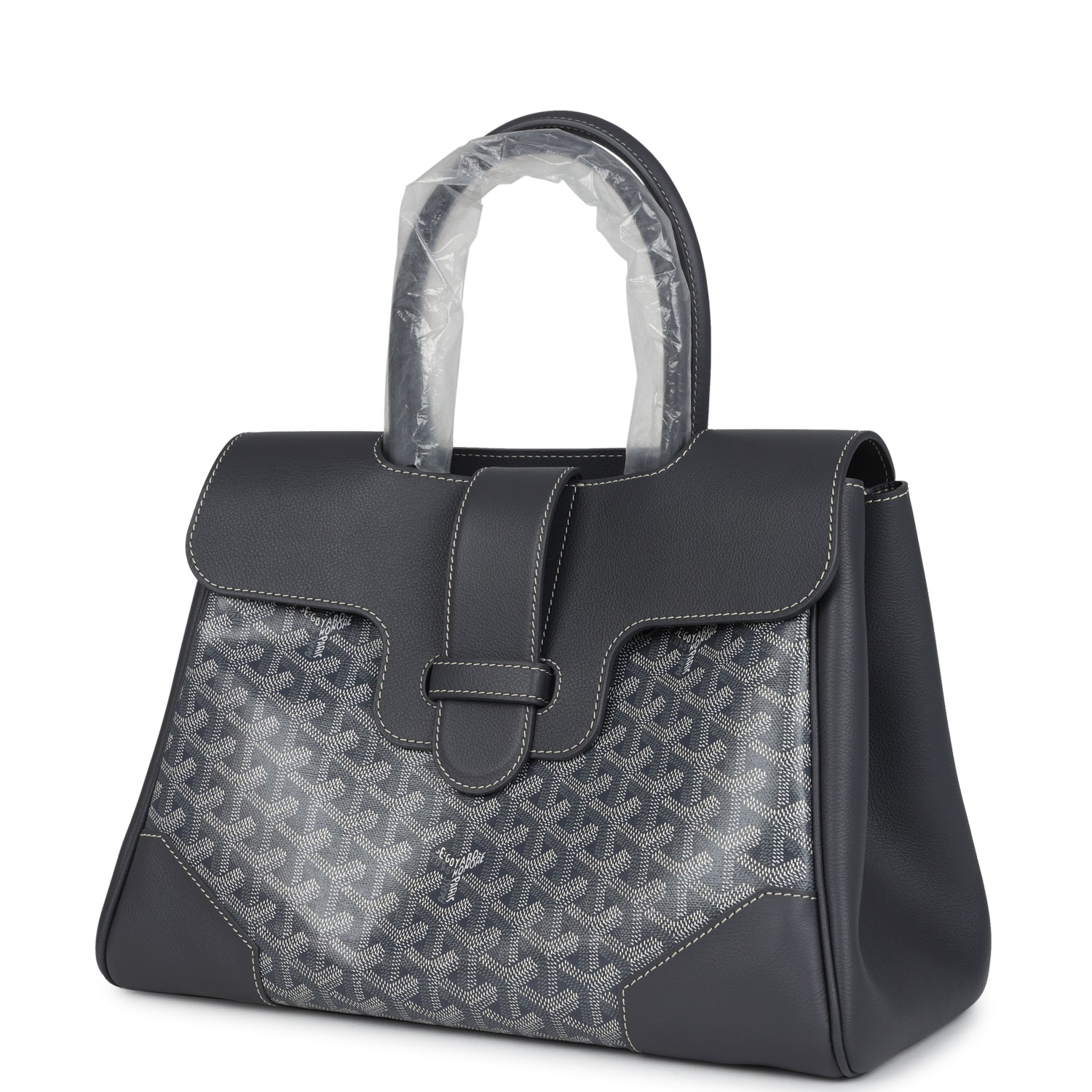 This soft Saigon tote is in grey Goyardine coated canvas and chevroches calfskin with palladium tone hardware, contrast stitching, features two double rolled top handles, signature Saigon leather strap and loop closure, a cutout in the top of the flap for the handle to fit through.