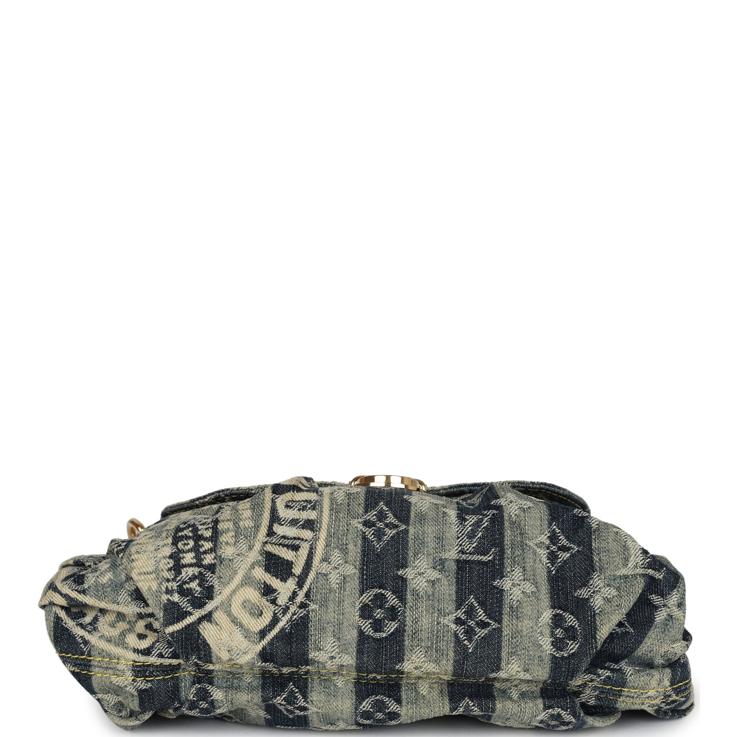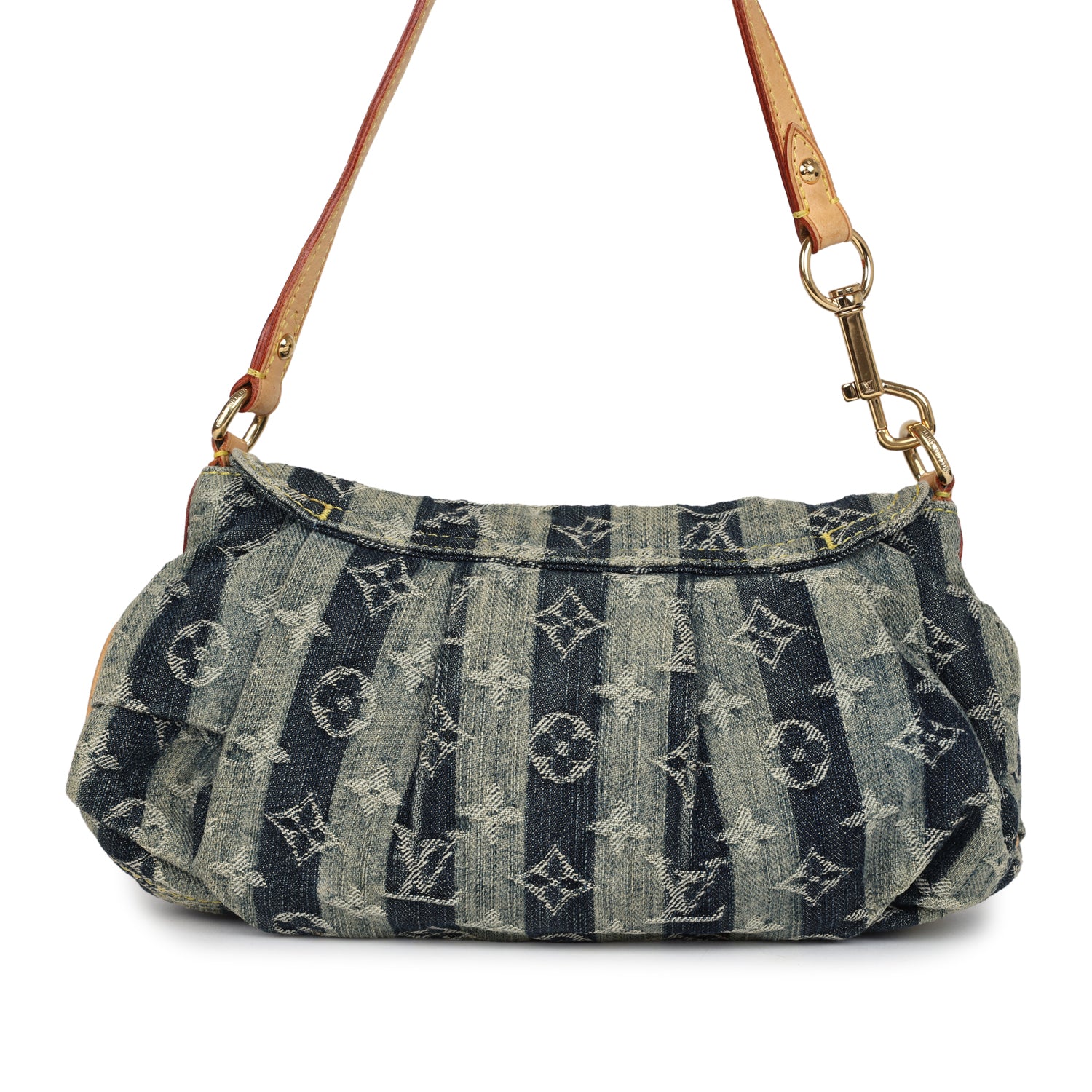 This Vintage Louis Vuitton mini striped Pleaty Raye shoulder bag is in blue washed monogram denim with gold hardware, featuring washed/distressed striped monogram denim fabric, front flap with a brass press lock closure, and a vachette cowhide leather shoulder strap.