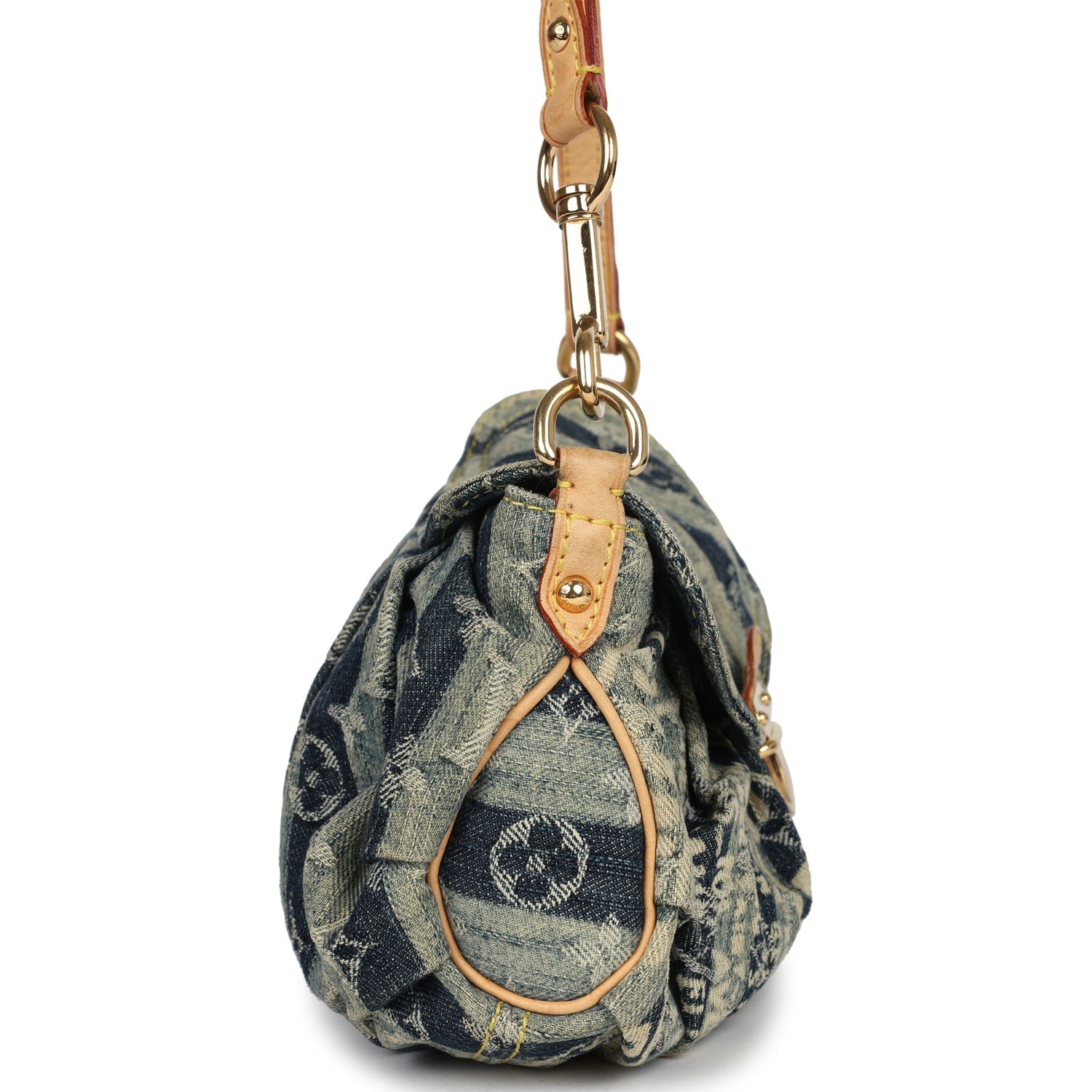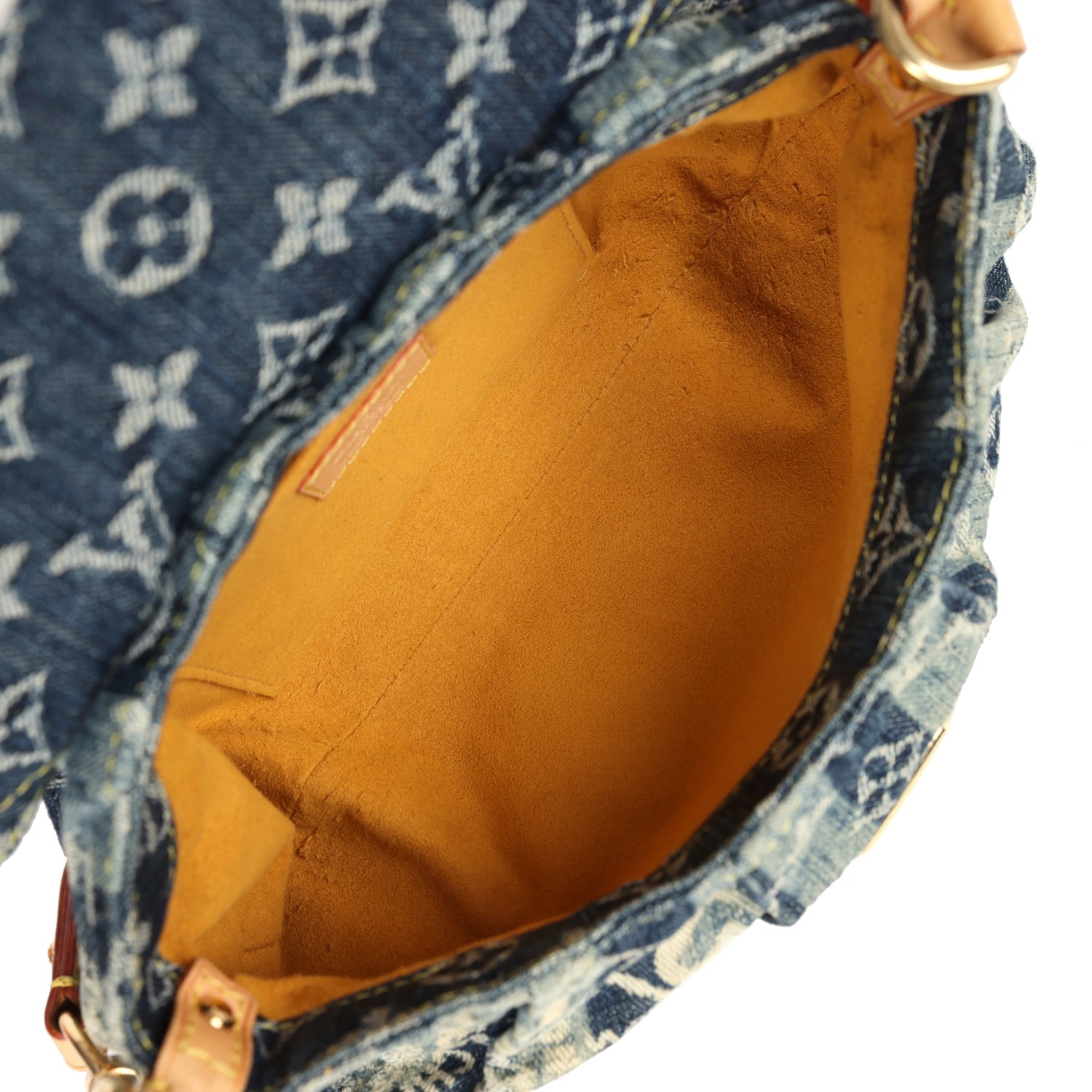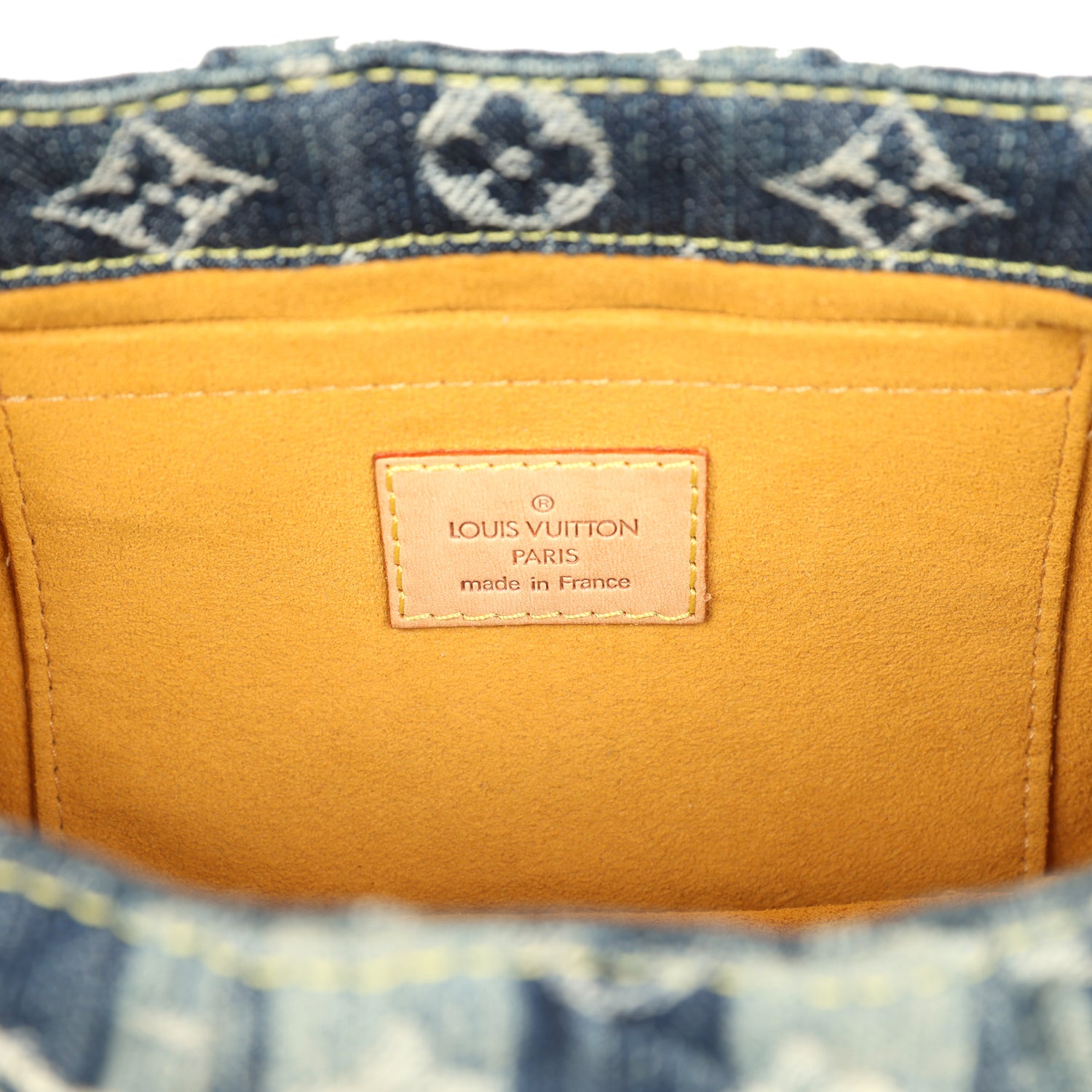 Condition: Vintage;?Excellent -?This bag retains its shape. There is no plastic on the hardware. There are visible scratches to the closure hardware. The exterior denim fabric is clean overall with some minor fading. The vachetta cowhide trimming has some minor staining and discoloration. The interior lining has faint smell due to age and storage. The microfiber lining is lightly pilling but is clean.
