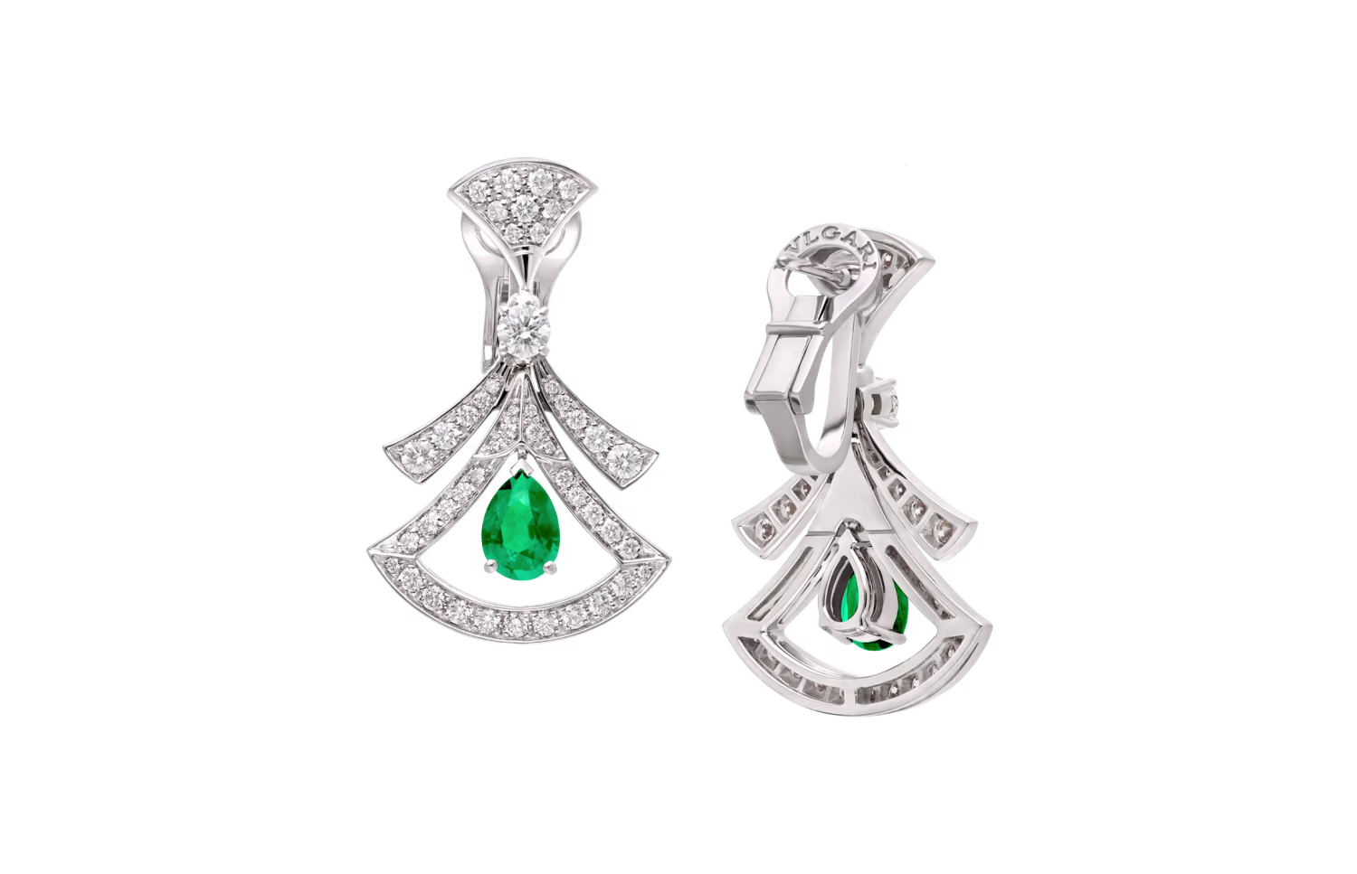 Embodying Italian elegance, the DIVAS’ DREAM earrings epitomises the legacy of a diva, with her mysterious, unforgettable allure. Quintessentially feminine and refined, the fan-shaped motif draws inspiration from the colourful mosaics of the Roman Baths of Caracalla, reflecting Bvlthtgari's integral bond with the Eternal City through the very essence of Italian beauty. In a play between full and empty displayed in its openwork design, the signature shape of the collection is reinterpreted with a light and delicate touch. DIVAS' DREAM 18 kt white gold openwork earrings with pear-shaped emeralds, round brilliant-cut and pavé diamonds.