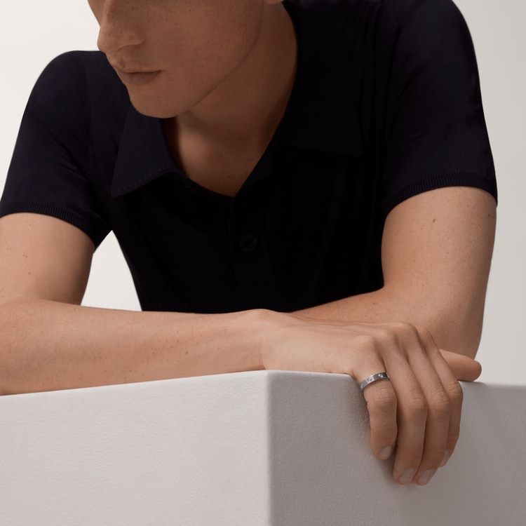 LOVE wedding band, 18K white gold (750/1000), set with 8 brilliant-cut diamond totaling 0.19 carats. Width: 4 mm (for size 52).