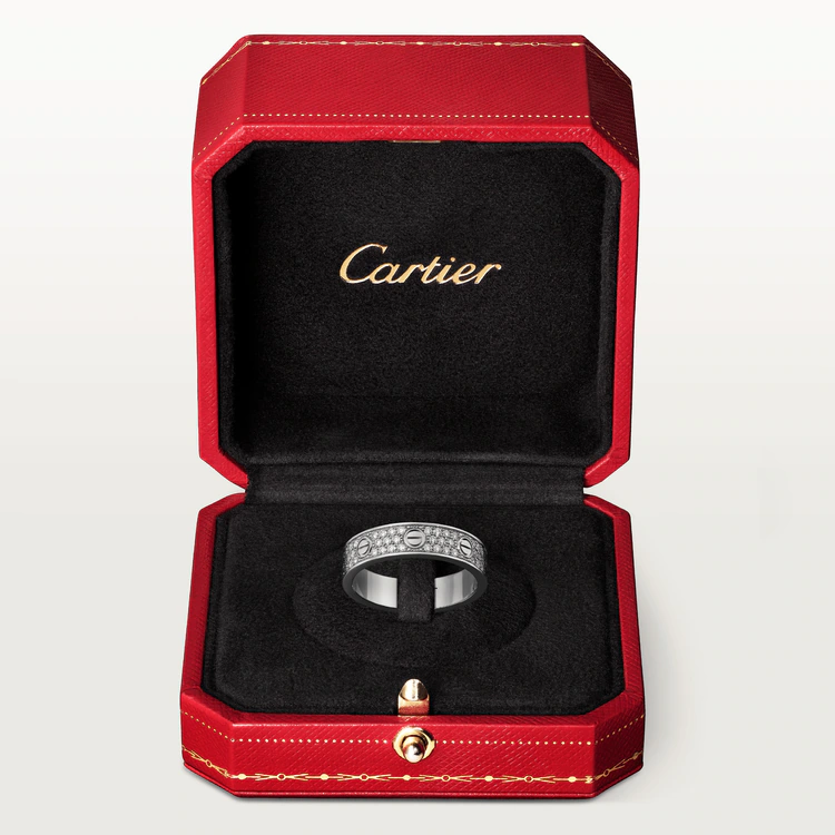 LOVE wedding band, 18K rose gold (750/1000), set with 88 brilliant-cut diamonds totaling 0.31 carats (for size 52). 4 to 5 width following sizes.