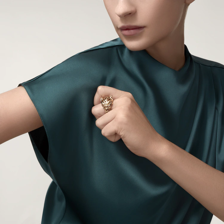 Panthère de Cathtrtier ring, 18K yellow gold (750/1000), onyx, set with 2 tsavorite garnets (for size 52).